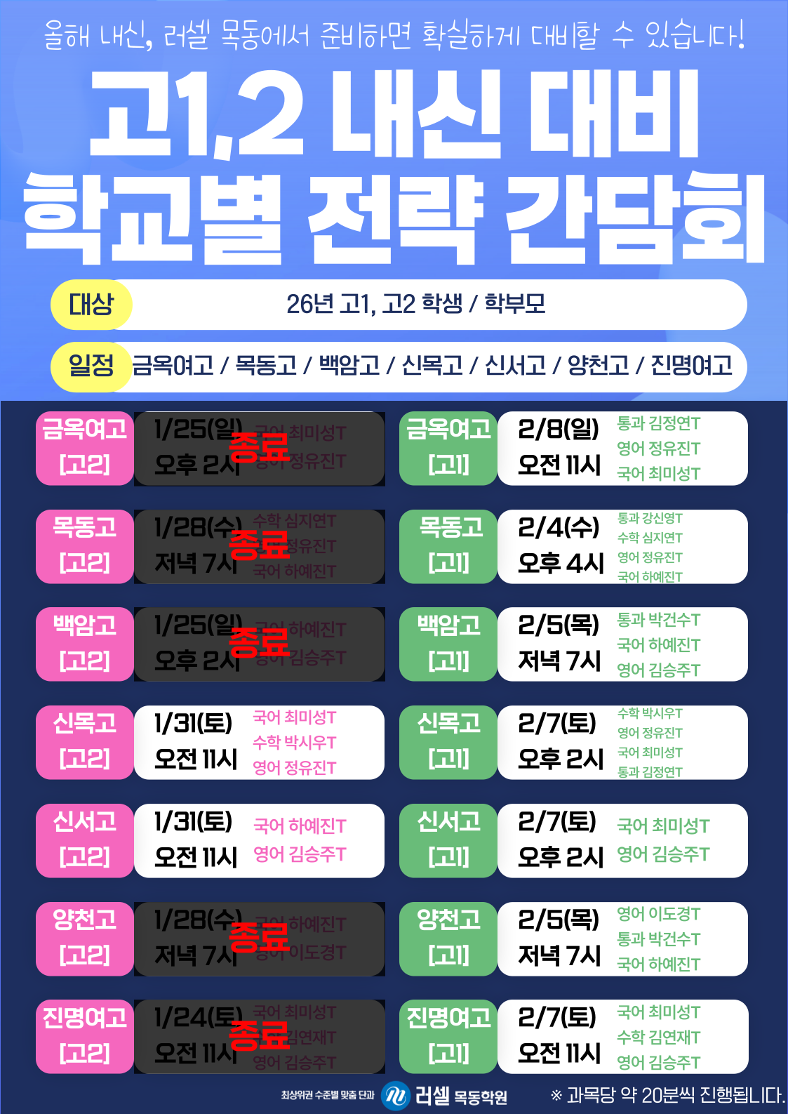 | ¡æ¡¼°£´ãȸ¡½ °í1,2 ³»½Å ´ëºñ Çб³º° Àü·« °£´ãȸ (±Ý¿Á¿©°í, ¸ñµ¿°í, ¹é¾Ï°í, ½Å¸ñ°í, ½Å¼°í, ¾çõ°í, Áø¸í¿©°í) | |||